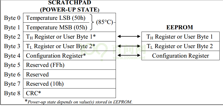 64 位配置存储器(SCRATCHP)由 9 个 Byte 组成,包含温度数据、配置信息等,具体格式如下图: