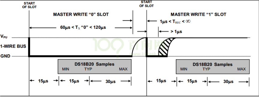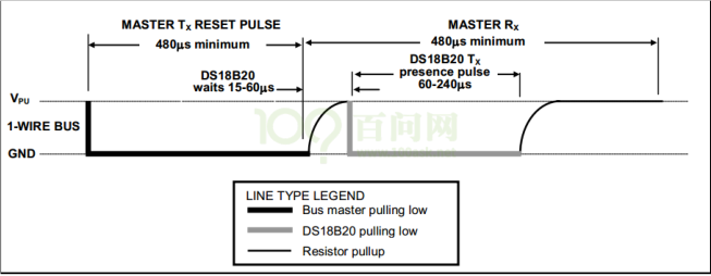 深黑色线表示由主机驱动信号,浅灰色线表示由 DS18B20 驱动信号。