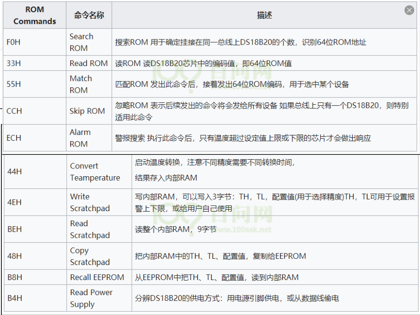 DS18B20 中有两类命令:ROM 命令、功能命令,列表如下