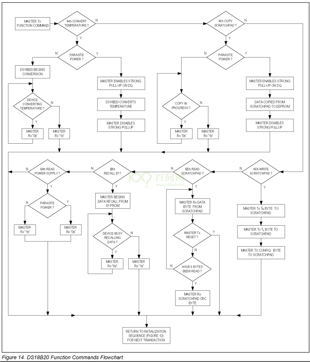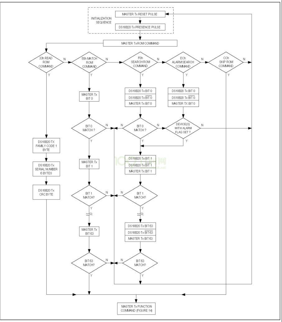 DS18B20 芯片手册中有 ROM 命令、功能命令的流程图,先贴出来,下一小