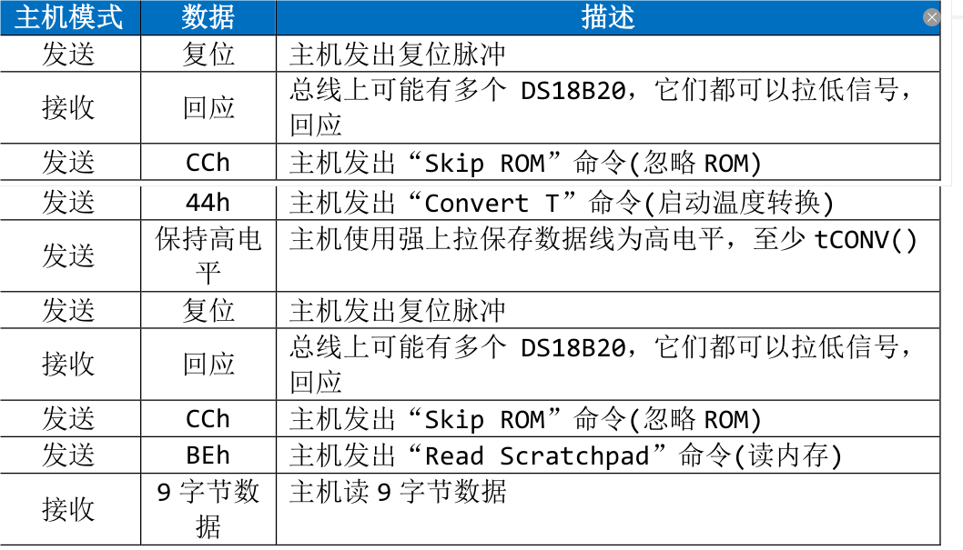 总线上只一个 DS18B20 设备时,根据下表发送命令、读取数据。因为只有一个 DS18B20,所以不需要选择设备,发出“Skip ROM”命令。然后发户“ConvertT”命令启动温度转换;