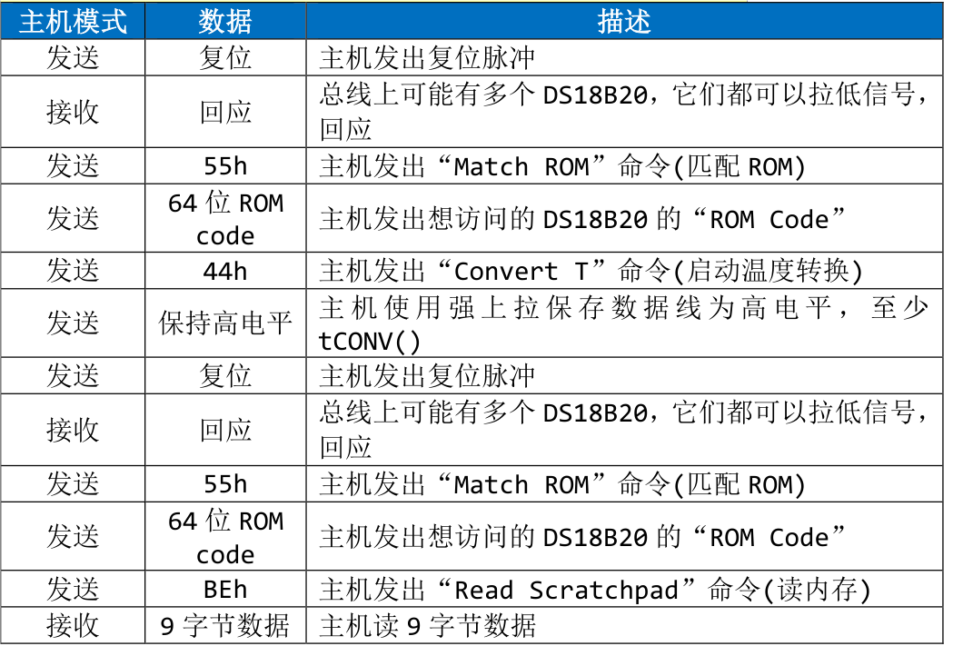 总线上有多个 DS18B20 设备时,根据下表发送命令、读取数据。首先肯定是要选中指定设备:使用“Match ROM”命令发出 ROM Code 来选择中设备;然后发户“Convert T”命令启动温度转换;等待温度转换成功后,要读数据前,也要发出“Match ROM”命令、ROM Code。下表列得很清楚: